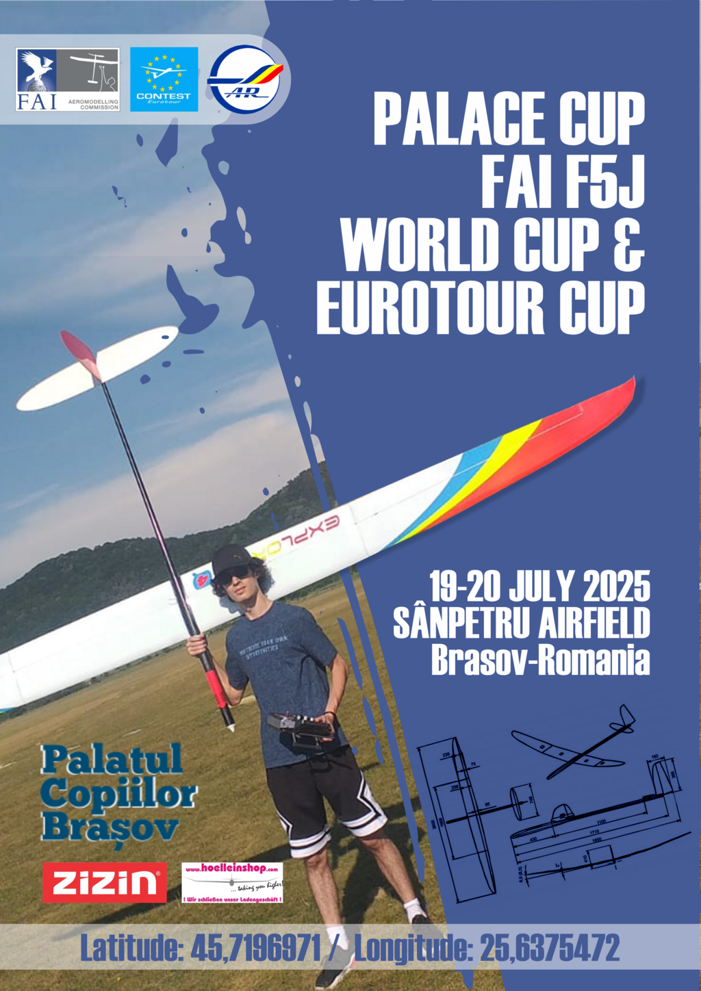 În perioada 19-20 iulie 2025 va avea loc la Aerodromul Sînpetru jud. Brașov prima ediție a ”PALACE CUP FAI F5J”. Evenimentul este cuprins atât în calendarul FRMd cât și în calendarele FAI și EUROTUR. Vă așteptăm cu drag să vă bucurați de zbor alături de noi.